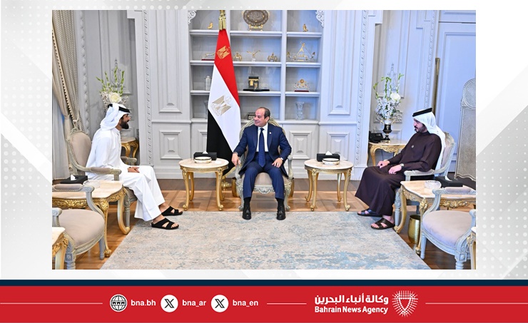 ورحّب فخامة الرئيس عبد الفتاح السيسي رئيس جمهورية مصر العربية بسمو الشيخ ناصر بن حمد آل خليفة وسمو الشيخ خالد بن حمد آل خليفة، معربًا عن تقدير مصر الكبير لسياسات وجهود حضرة صاحب الجلالة الملك حمد بن عيسى آل خليفة ملك البلاد المعظم حفظه الله ورعاه، ومؤكدًا حرص مصر على مواصلة التنسيق والتعاون المشترك مع البحرين في جميع المجالات، بما يعكس العلاقات التاريخية المتينة بين البلدين، ويخدم مصالح وتطلعات الشعبين الشقيقين، لا سيما في ظل التحديات التي تواجه المنطقة.