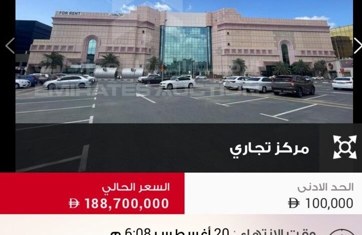 بيع مركز «لامسي بلازا» للتسوق، الواقع في منطقة عود ميثاء بدبي، بقيمة 188.7 مليون درهم، وذلك خلال مزاد أقيم يوم الأربعاء الموافق 20 أغسطس الجاري.