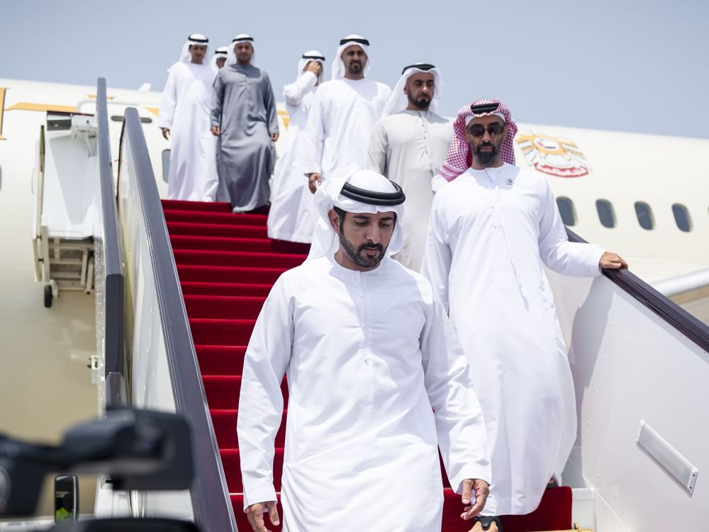 ويرافق سموه خلال الزيارة وفد يضم كلاً من، سمو الشيخ حمدان بن محمد بن راشد آل مكتوم ولي عهد دبي نائب رئيس مجلس الوزراء وزير الدفاع، وسمو الشيخ طحنون بن زايد آل نهيان نائب حاكم إمارة أبوظبي مستشار الأمن الوطني، والفريق سمو الشيخ سيف بن زايد آل نهيان نائب رئيس مجلس الوزراء وزير الداخلية، وسمو الشيخ ذياب بن محمد بن زايد آل نهيان نائب رئيس ديوان الرئاسة للشؤون التنموية وأسر الشهداء، وسمو الشيخ حمدان بن محمد بن زايد آل نهيان نائب رئيس ديوان الرئاسة للشؤون الخاصة، ومعالي الشيخ محمد بن حمد بن طحنون آل نهيان مستشار رئيس الدولة، ومعالي علي بن حماد الشامسي الأمين العام للمجلس الأعلى للأمن الوطني، ومعالي الدكتور أحمد مبارك المزروعي رئيس مكتب رئيس الدولة للشؤون الإستراتيجية رئيس مكتب أبوظبي التنفيذي، ومعالي الدكتور سلطان بن أحمد سلطان الجابر وزير الصناعة والتكنولوجيا المتقدمة، وعدد من كبار المسؤولين.