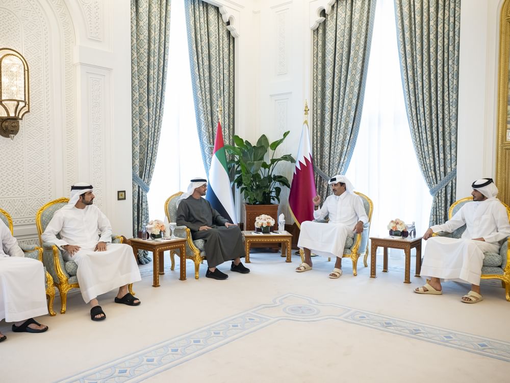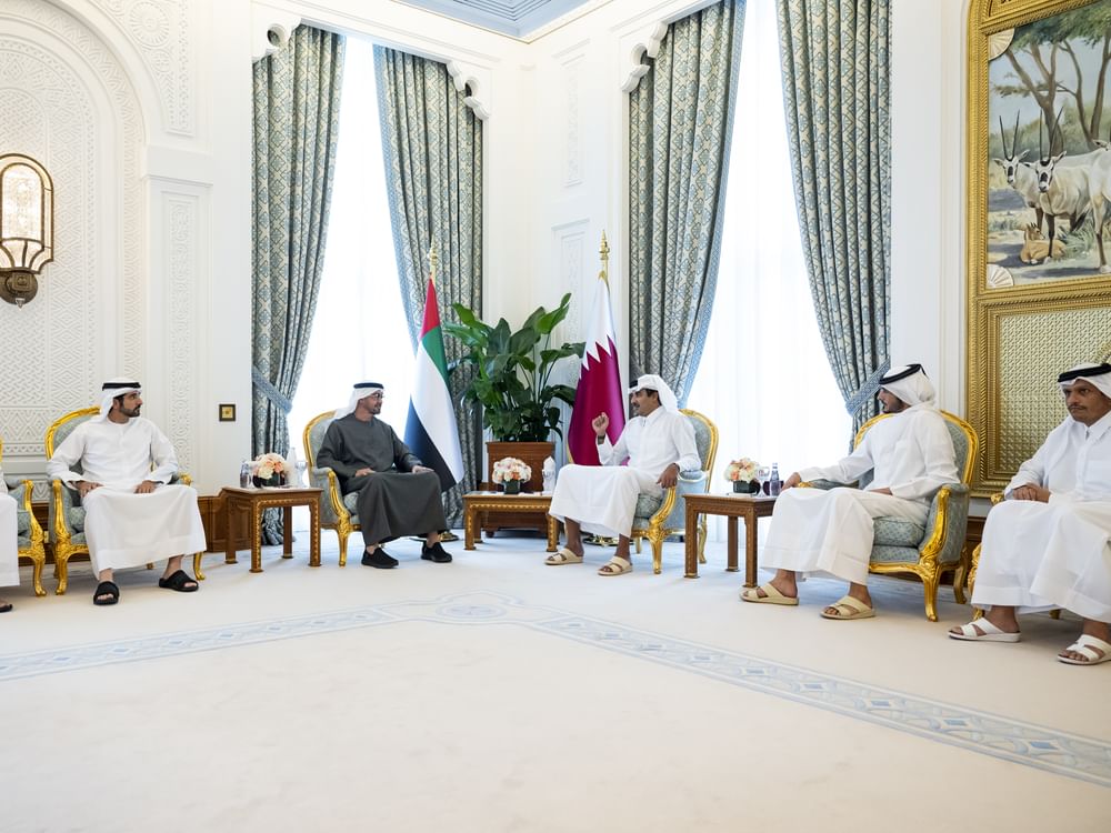 جاء ذلك خلال لقاء صاحب السمو رئيس الدولة أخاه صاحب السمو الشيخ تميم بن حمد آل ثاني في الديوان الأميري في الدوحة في زيارة أخوية إلى قطر.