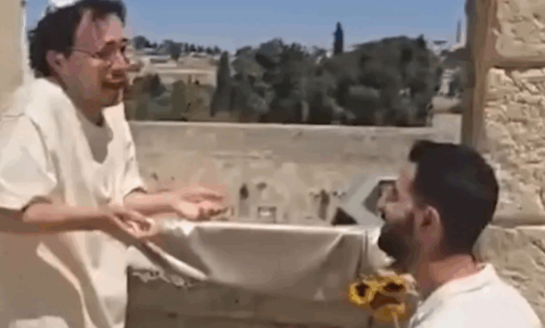 تداول رواد مواقع التواصل الاجتماعي مقطع فيديو يظهر مستوطنا إسرائيليا وهو يعرض الزواج على مستوطن آخر أمام حائط البراق في القدس.