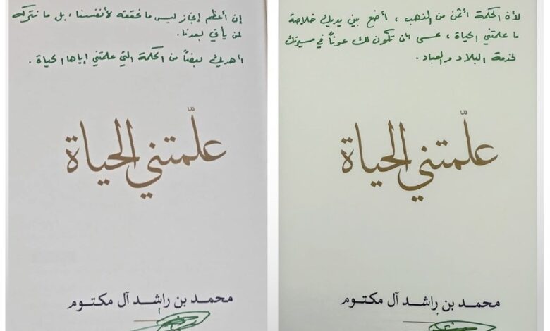 وأهدى سموه نسخة خاصة من كتاب «علمتني الحياة» الخاصة، بتوقيع سموه لسمو الشيخ حمدان بن محمد وكتب سموه بخط يده في الإهداء: «إلى ابني وسندي وعضيدي، حمدان بن محمد، لأن الحكمة أثمن من الذهب، أضع بين يديك خلاصة ما علمتني الحياة، عسى أن تكون لك عوناً في مسيرتك لخدمة البلاد والعباد».