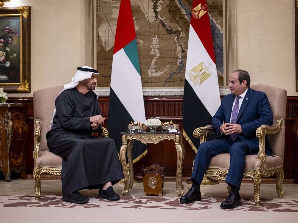 ورحب فخامة الرئيس المصري – خلال استراحة قصيرة في قاعة كبار الزوار في المطار – بصاحب السمو رئيس الدولة، وتبادلا الأحاديث الودية التي تعبر عن عمق العلاقات الأخوية التي تجمع البلدين الشقيقين والحرص المتبادل على مواصلة تعزيزها.