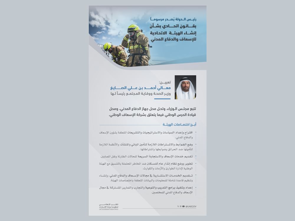أصدر صاحب السمو الشيخ محمد بن زايد آل نهيان، رئيس الدولة، حفظه الله، مرسوماً بقانون اتحادي بشأن إنشاء الهيئة الاتحادية للإسعاف والدفاع المدني، ومرسوماً اتحادياً بتعيين معالي أحمد بن علي الصايغ، وزير الصحة ووقاية المجتمع، رئيساً لها.