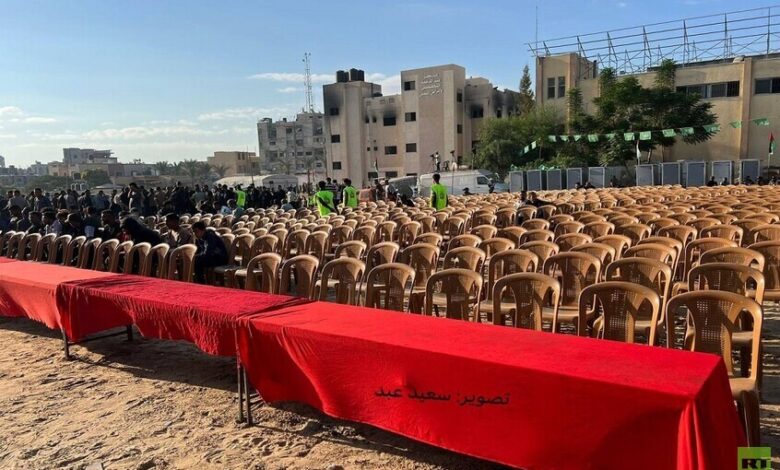 أظهرت الصور من قطاع غزة صفوف الكراسي والطاولات في إحدى الساحات استعدادا لاستقبال يليق بالأسرى الفلسطينين المحرريين من سجون إسرائيل والذين تلقوا سابقا أحكاما بسنوات سجن متفاوتة وصلت إلى “المؤبد” للعديد منهم.