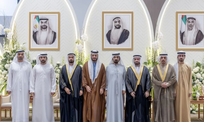 حضر صاحب السمو الشيخ محمد بن راشد آل مكتوم نائب رئيس الدولة رئيس مجلس الوزراء حاكم دبي، رعاه الله، يرافقه سموّ الشيخ حمدان بن محمد بن راشد آل مكتوم، ولي عهد دبي، نائب رئيس مجلس الوزراء، وزير الدفاع، رئيس المجلس التنفيذي لإمارة دبي، حفل الاستقبال الذي أقامه اليوم معالي فيصل عبد العزيز البناي في أبوظبي بمناسبة زفاف نجليه “عبد العزيز”، إلى كريمة نجيب إبراهيم محمد الزرعوني، و”عبدالله ” إلى كريمة سمير مير عبد العزيز الخوري.