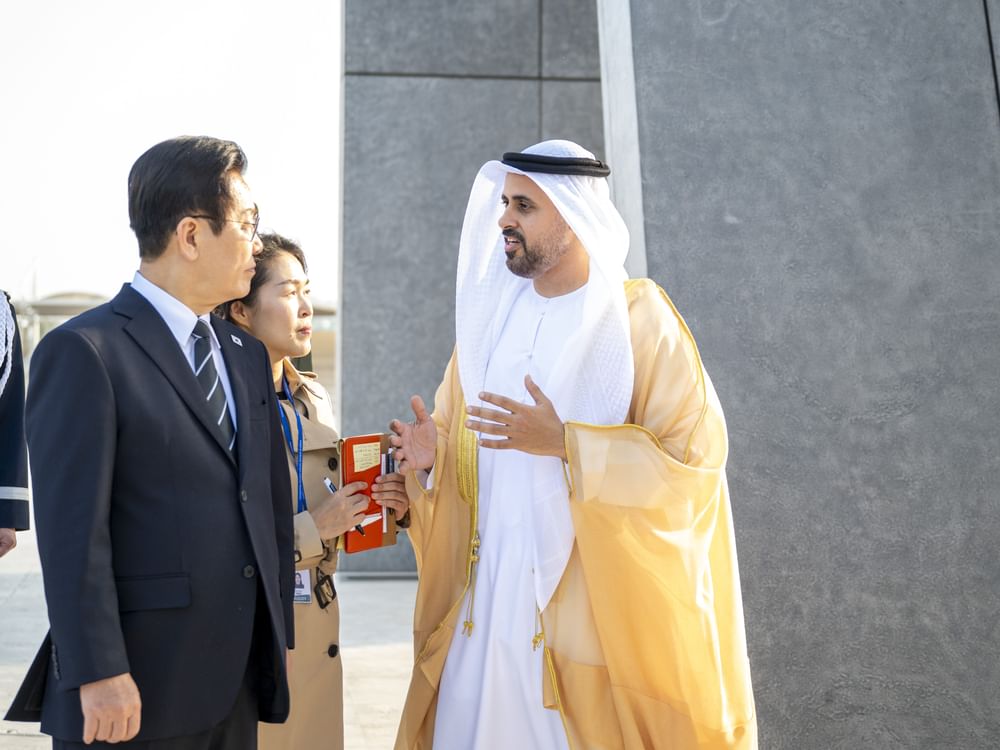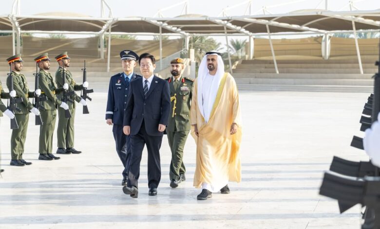استقبل سموّ الشيخ ذياب بن محمد بن زايد آل نهيان، نائب رئيس ديوان الرئاسة للشؤون التنموية وأسر الشهداء، في واحة الكرامة، فخامة لي جيه ميونغ، رئيس جمهورية كوريا، ضمن زيارته للدولة حالياً.