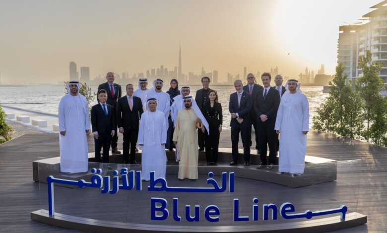 وفي ختام الحفل التقطت صوره تذكارية لصاحب السمو الشيخ محمد بن راشد آل مكتوم، مع فريق العمل المشرف على تنفيذ الخط الأزرق من الهيئة والتحالف المنفذ للمشروع والاستشاري.
