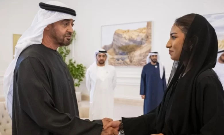محمد بن زايد يستقبل روضة عيسى السركال أول اماراتية تنال لقب أستاذة دوليةبلعبة الشطرنج