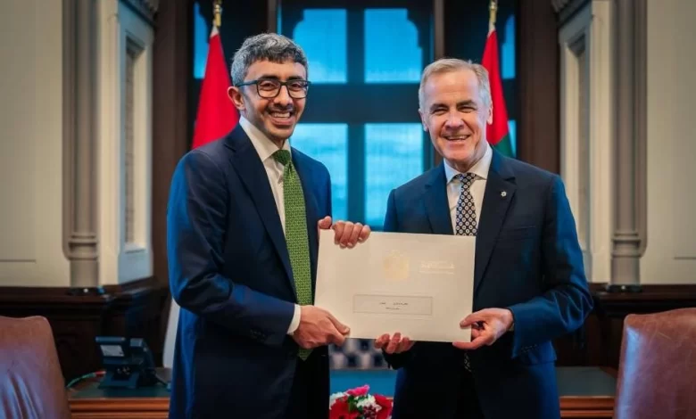 سلم الرسالة سمو الشيخ عبدالله بن زايد آل نهيان، نائب رئيس مجلس الوزراء وزير الخارجية، لدى لقائه مارك كارني، رئيس وزراء كندا، وذلك في مستهل زيارة عمل يقوم بها سموه إلى العاصمة الكندية أوتاوا.