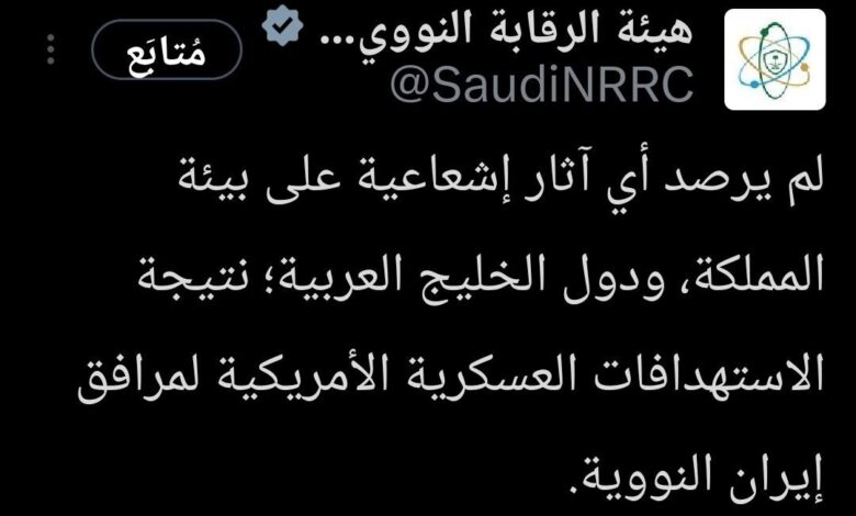 وكتب حساب هيئة الرقابة النووية والإشعاعية في السعودية عبر منصة “إكس”: “هيئة الرقابة النووية والإشعاعية في السعودية لم ترصد أي آثار إشعاعية على بيئة المملكة ودول الخليج العربية نتيجة الاستهدافات العسكرية الأمريكية لمرافق إيران النووية”.