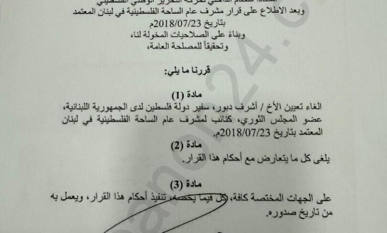 أفادت وسائل إعلام لبنانية اليوم السبت، بأن الرئيس الفلسطيني محمود عباس أعفى سفير بلاده لدى بيروت أشرف دبور من بعض مهامه في لبنان.